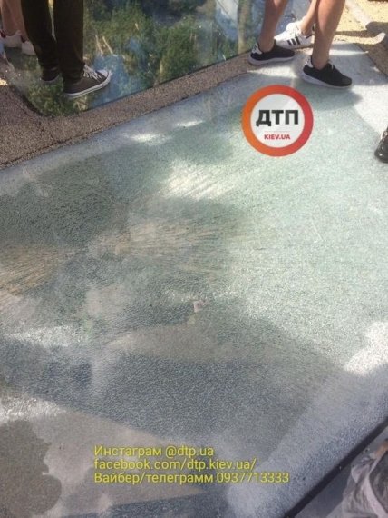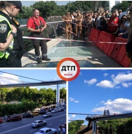 На пешеходно-велосипедном мосту в Киеве, который только 25 мая торжественно открыл мэр Киева Виталий Кличко с братом Владимиром, треснула стеклянная вставка. Произошло это после того, как группа неизвестных активно на нем попрыгала. По другой версии, в мост стреляли.