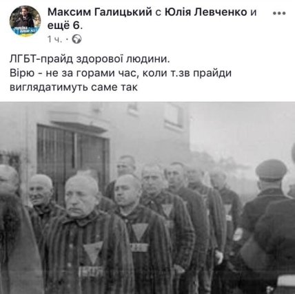 Вчера поздно вечером заместитель городского головы города Сумы Максим Галицкий опубликовал в Facebook фотографию узников нацистского концлагеря Заксенхаузен с нашитыми на одежду перевернутыми вершинами вниз треугольниками (в концлагерях Третьего Рейха такими розовыми треугольниками обозначали гомо- и бисексуальных мужчин), которую подписал ЛГБТ-прайд здоровой человека, передает УНН со ссылкой на Информационный портал Харьковской правозащитной группы.