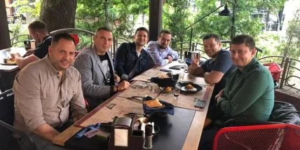 Президент Украины Владимир Зеленский празднует День Конституции в кафе вместе с тремя топ-менеджерами Офиса Президента и двумя своими помощниками.