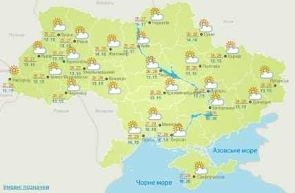 Температура ночью 12-17°, на побережье морей до 21°; днем 24-29°, на юге и Закарпатье местами 30-32°.