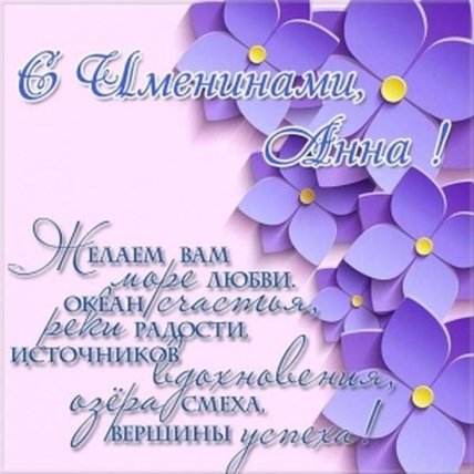 Поздравляю, прекрасная Анна. Желаю, чтобы жизнь была наполнена прекрасным, светлым и добрым. Пусть ясным будет небо, пусть ярко светит солнышко, пусть иногда идет спокойный ровный дождь, после которого появляется радуга в жизни и красивые полевые цветы. Пусть в жизни будет много целей, стремление к ним и успешное их достижение, пусть будет искренней любовь и настоящим счастье.