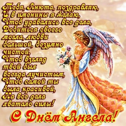 Очаровательная Анюта, поздравляю сегодня тебя. Желаю тебе благосклонности судьбы и надежного ангела-хранителя, неземного счастья и совершенства в любой работе, веселого досуга в приятной компании, понимания близких, искренней любви, верной удачи и полной самореализации.