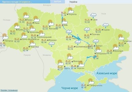 Температура ночью 10-15°, на побережье морей до 18°, днем 18-23°, на юге, востоке страны и в Днепропетровской области 23-28°.