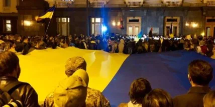 Митингующие опасаются, что реализация "формулы Штайнмайера" приведет к потере Украиной государственного суверенитета, а выборы пройдут "под дулами российских автоматов".