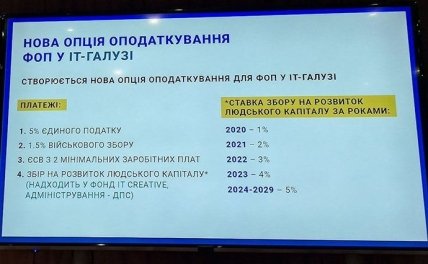 Правительство хочет создать новую группу плательщиков единого налога для физлиц-предпринимателей, которые работают в IT-сфере (по IT-КВЭДам). Об этом премьер-министр Алексей Гончарук и глава Государственной налоговой службы Сергей Верланов сообщили 4 сентября в ходе встречи с экспортной IT-индустрией. Предусматривается, что, кроме 5%-ного единого налога, 1,5%-ного военного сбора и ЕСВ с двух минимальных зарплат, IT-специалисты будут платить сбор на развитие человеческого капитала. Администрировать его будет Государственная налоговая служба. Ввести новую группу плательщиков единого налога планируется уже с 1 января 2020 года. Для этого осенью нужно внести соответствующие изменения в законодательство. Cтавка нового сбора будет постепенно поднята с 1% в 2020 году до 5% в 2024 году. Он будет поступать в фонд IT Creative.