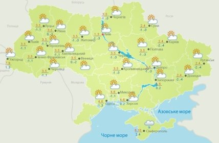 Температура ночью 3-8° мороза, днем от 2° мороза до 3° тепла; в западной и южной частях значительно теплее - ночью около 0°, днем 1-5 ° тепла; на Закарпатье и в Крыму 6-11° тепла.