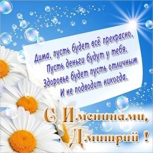 Поздравляю тебя, Дима, с твоим чудесным праздником. Желаю счастья в жизни и успеха в деятельности, достатка в доме и яркого света в душе, искренней любви в сердце и неимоверной бодрости в теле, интересных идей в голове и крепкого здоровья в организме.