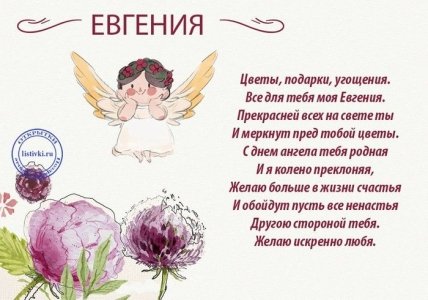 Дорогая Женечка, я тебя от души поздравляю с твоим светлым и чудесным праздником. Пожелать тебе хочу добрых моментов жизни и радостных событий, неотразимой красоты и бодрости души, отменного здоровья и великолепия души, большого уважения и нескончаемого счастья в жизни.