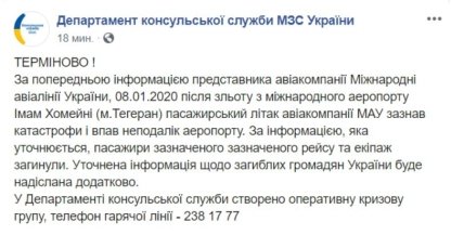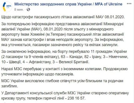 07:33 Первый официальный комментарий. Департамент консульской службы МИД Украины подтвердил информацию о крушении самолета МАУ в Иране. Все пассажиры и экипаж погибли.