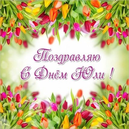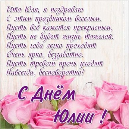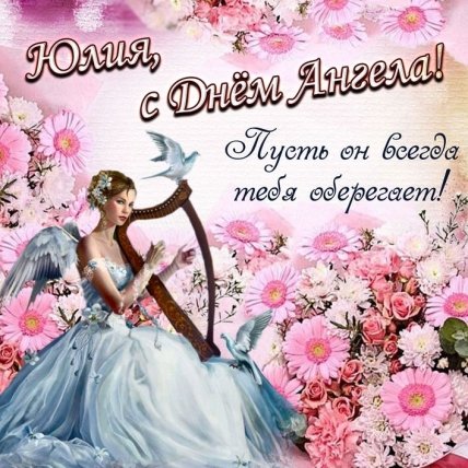 Дорогая Юлия, поздравляю тебя с именинами и от всего сердца желаю тебе быть счастливой. Желаю здоровья, любви и успехов в работе... В общем, того, что ты и сама себе желаешь, но в двойном, а то и тройном размере. Пусть солнце освещает твой путь в жизни, а люди радуют тебя.