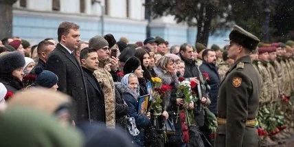 Президент Украины Владимир Зеленский в понедельник утром принял участие в мероприятиях памяти "киборгов" - военнослужащих, которые в этот день в 2015 году погибли при обороне Донецкого аэропорта во время войны на востоке Украины.