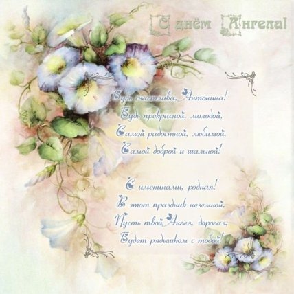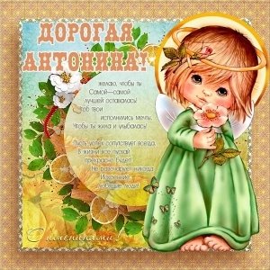Дорогая Антонина, я тебя от души поздравляю и пожелать хочу, чтобы на лице искренне сияла улыбка, чтобы глаза светились от счастья, чтобы сердце было наполнено любовью, чтобы душа стремилась к заветным мечтам и добрым поступкам, чтобы руки всегда были заняты любимым делом, а ноги, чтобы всегда шли по дороге счастья.
