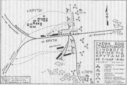 Украинские войска заняли оборону у станции Круты. Утром 29 января 1918 года началось наступление на украинские позиции 4-тысячного большевистского отряда петроградских и московских красногвардейцев. Украинская армия, которой суждено было вступить в кровавую схватку с этой ордой, насчитывала около 300 бойцов Студенческого куреня, 250 - Первой украинской военной школы и почти 40 гайдамаков - вот и все.