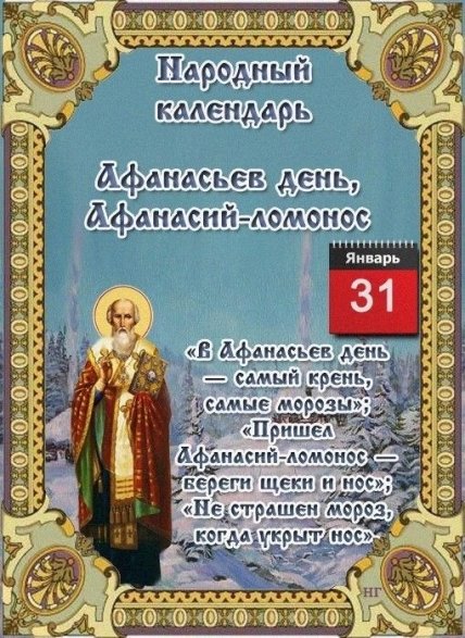 "Идет Афанасий-ломонос, береги, мужик, свой нос!" - говорится в пословице, потому что именно с этими днями в народе связано ожидание серьезных афанасьевских морозов, которые иногда даже считали лютыми, то есть жестокими, злыми. Лютым зверем в Древней Руси называли леопарда, истребленного еще при Владимире Мономахе. Так что эти морозы действительно были страшными - крестьяне, которые ездили с обозами в крупные города, часто обмораживали лица, руки, ноги.