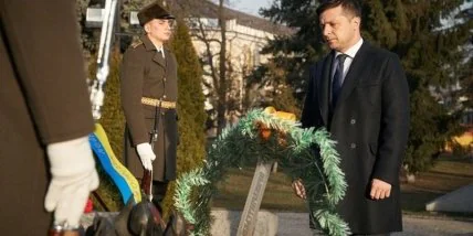 Так, вместе с воинами почетного караула Зеленский возложил цветы к скульптуре в мемориале.