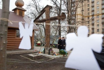 Президент Украины и первая леди установили лампадки у креста на месте гибели активистов в Киеве. Прозвучали поминальные колокола.