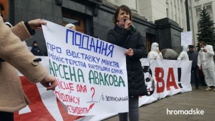 Участники акции хотели оставить у Офиса президента плакат с надписью: "Представление об отставке министра внутренних дел Арсена Авакова" и вопросом у подписи Владимира Зеленского, но правоохранители не позволили.