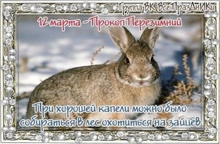 В народе говорили, что именно с 12 марта зима окончательно уходит из своих владений, уступая место весне. Снег начинает таять, но есть огромный минус этого явления – распутница. Если дороги размывало талой водой, то санный путь был очень трудным и даже опасным. Дороги были грязными, в них вязли повозки с лошадьми. Именно поэтому, начиная с дня Прокопа, 12 марта, и до тех пор, пока дороги немного не подсохнут, старались не отправляться в дальние поездки без особой нужды. В этот день крестьяне ходили в баню, коротали время, выполняя несложную работу. А вот, что касается охотников, то они на Прокопа точно не сидели дома, поскольку в это время очень хорошо ловилась дичь, можно было поймать зайца. По примете 12 марта рыбакам тоже везло с уловом, поскольку большие реки вскрывались ото льда.