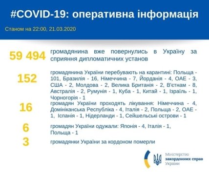 По состоянию на 22:00 21 марта после закрытия границ из-за пандемии коронавируса в Украину при содействии дипломатических учреждений вернулись 59 494 граждане, что на 13,5 тыс. больше статистики предыдущего дня. Об этом 21 марта сообщила пресс-служба Министерства иностранных дел в Facebook.