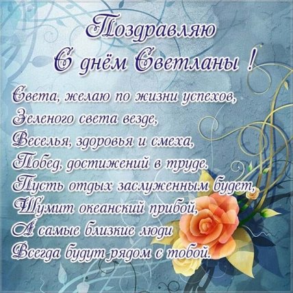 Имя Светлана имеет несколько версий происхождения. По первой версии, имя Светлана было придумано и впервые использовано А.Х.Востоковым в романсе "Светлана и Мстислав" (1802). Широкую популярность получило после опубликования поэтом Василием Андреевичем Жуковским его баллады "Светлана". Также есть версия, что имя было придумано А.С.Пушкиным.