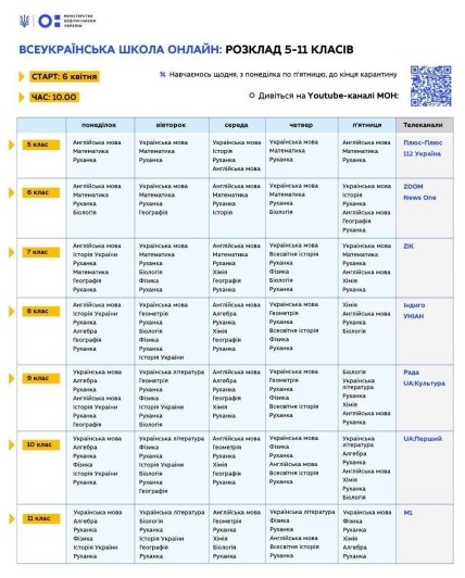 В понедельник, 6 апреля, для учащихся 5-11 классов стартует проект "Всеукраинская школа онлайн". Так, на время карантина уроки по 11 предметам по четкому расписанию будут транслироваться на украинских телеканалах и YouTube-канале Министерства образования и науки.