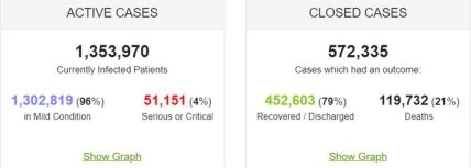 На данный момент на планете свыше 1,35 миллиона активных случаев заболевания COVID-19, из них примерно 4% — люди в тяжелом и критическом состоянии.