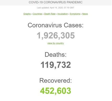 По состоянию на утро вторника общее число зафиксированных в мире случаев COVID-19 составляет свыше 1,92 миллиона, включая почти 120 тысяч смертельных и 451 884 пациента, которые уже вылечились.