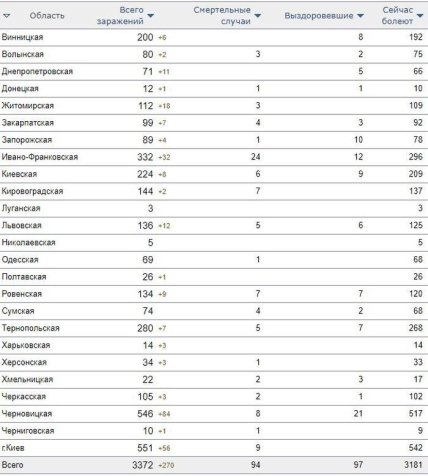 Заражение коронавирусом по областям Украины на 14.04.2020