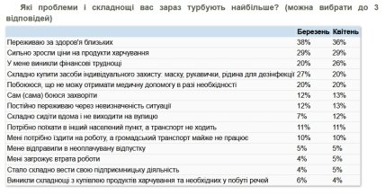 "Говоря о проблемах и сложностях, которые их сейчас беспокоят, респонденты чаще всего называли следующие (можно было выбрать до 3 ответов): переживают за здоровье близких - 36%; сильно выросли цены на продукты питания - 29%; возникли финансовые трудности - 26%; сложно купить средства индивидуальной защиты: маску, перчатки, жидкость для дезинфекции - 20%; опасаются, что не смогут получить медицинскую помощь в случае необходимости - 20%", - отмечают в КМИС.