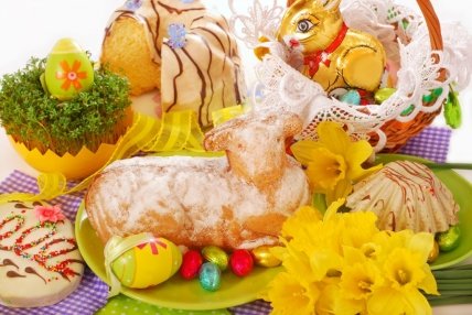 На пасхальном столе всегда простая, но сытная еда: курица, жаркое, ветчина, колбасы, рыба, картошка, вино. На сладкое сырная пасха, куличи, торты, компот. Все выставлено на красивой скатерти, где украшает стол верба и весенние цветы, проросшее зерно.