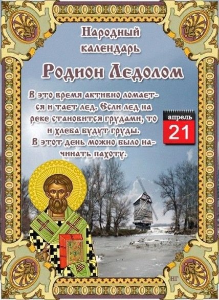 В народе святой Родион (Иродион) известен под именем Ледолома, потому что в это время активно ломается и тает лед. За ним наблюдают и делают определенные прогнозы на будущее. Например, считается, что если лед на реке становится грудами, то и хлеба будут груды.