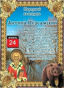 Антипа Пергамский, память которого отмечается в этот день, был учеником Иоанна Богослова, епископом Пергамской церкви. Согласно житию, язычники принуждали Антипа прекратить проповедь о Христе, но он отказался. За это его бросили в раскаленного медного вола в храме Артемиды. Христиане тайно погребли тело святого, а в 5 веке над его могилой построили храм. Мощи Антипа почитаются мироточивыми, а его гробница стала местом паломничества.