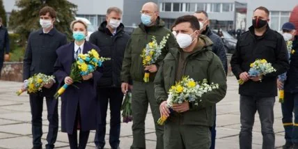 Президент Украины Владимир Зеленский и Премьер-министр Украины Денис Шмыгаль почтили память ликвидаторов аварии на Чернобыльской атомной электростанции и возложили цветы к памятнику Героям Чернобыля.