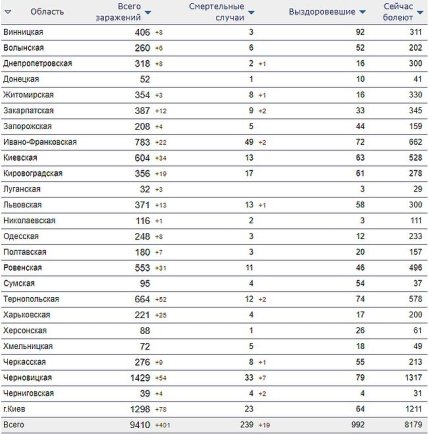 На утро 27 апреля в Украине было 9 009 лабораторно подтвержденных случаев Covid-19, количество выздоровевших пациентов (864) превышало количество летальных случаев (220). Таким образом, за минувшие сутки количество подтвержденных случаев заболевания возросло на 410, летальных случаев возросло на 19, количество случаев выздоровления - на 128.