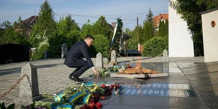"Президент Украины Владимир Зеленский почтил память погибших во Второй мировой войне минутой молчания и возложил цветы у Вечного огня в столичном парке Вечной Славы", - отметили в ОП.