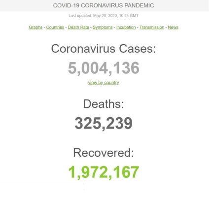 Число заразившихся коронавирусом по всему миру составило 5 004 136 человек, из них умерли - 325 239, вылечились - 1 197167.
