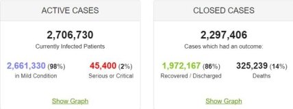 Согласно его статистике, зарегистрировано более 325 тыс. случаев смерти людей с коронавирусом.