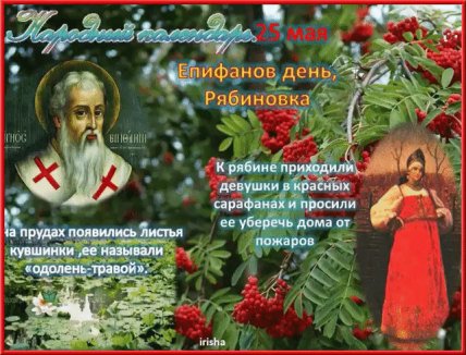 Рябиновкой этот день назывался в честь одного из самых любимых на Руси деревьев. К рябине приходили девушки в красных сарафанах и просили ее уберечь дома от пожаров. О том же молились и святому Епифанию. Кстати, считалось, что если утро этого дня будет «в красном кафтане» (то есть будет яркая заря), то пожаров летом случится много.