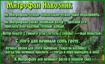 В народном прозвище Митрофана — Навозник — не было ничего оскорбительного для святого. Напротив, к навозу крестьяне всегда относились с уважением — как к залогу будущего урожая. На Митрофана землю обязательно нужно было подкормить. Люди говорили: "Без навоза-батюшки не жди хлеба от земли-матушки"; "Добрая земля навоз примет один раз, а помнить будет девять лет". Отлынивать от такой работы было чревато: "Обманешь поле один раз, а оно тебя — десять".