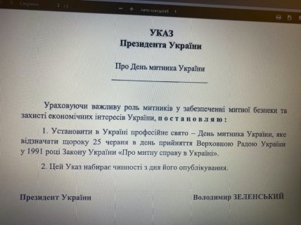 "Учитывая важную роль таможенников в обеспечении таможенной безопасности и защите экономических интересов, постановляю: установить в Украине профессиональный праздник - День таможенника Украины, который отмечать ежегодно 25 июня", - говорится в тексте документа.