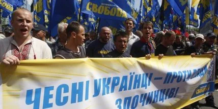 По свидетельствам очевидцев, подрались представители партии "Свобода" и сторонники "Партии регионов" из-за БТР, который пытались убрать свободовцы.
