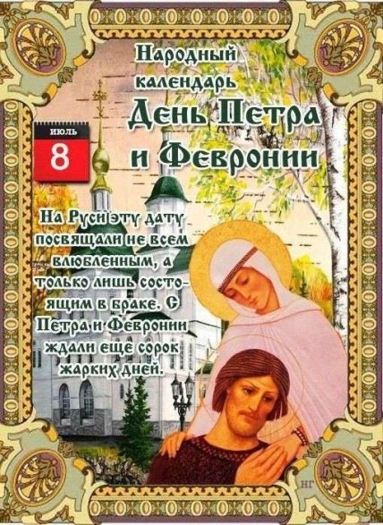 К Петру и Февронии, святым покровителям этого дня, обращаются с просьбой о благополучии в семье и о благословении на вступающих в брак, это день семьи, любви и верности. В народе говорили: если работать на Петра и Февронию бок о бок с женой, это принесет счастье в семью и достаток в дом. Это время — самый разгар сенокоса.