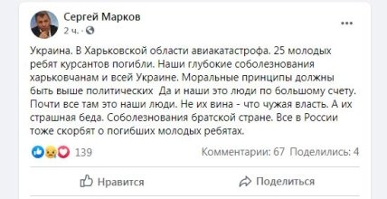 "Украина. В Харьковской области авиакатастрофа. 25 молодых ребят курсантов погибли. Наши глубокие соболезнования харьковчанам и всей Украине. Моральные принципы должны быть выше политических Да и наши это люди по большому счету. Почти все там это наши люди. Не их вина - что чужая власть. А их страшная беда. Соболезнования братской стране. Все в России тоже скорбят о погибших молодых ребятах", - написал Марков.