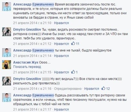 Ермольченко в 2014 году давал комментарии российским СМИ, в которых говорил о неуместности привлечения украинской армии, поскольку "митинги являются мирными".