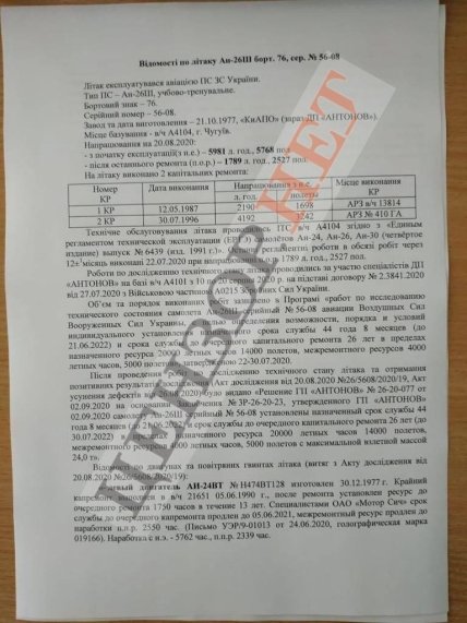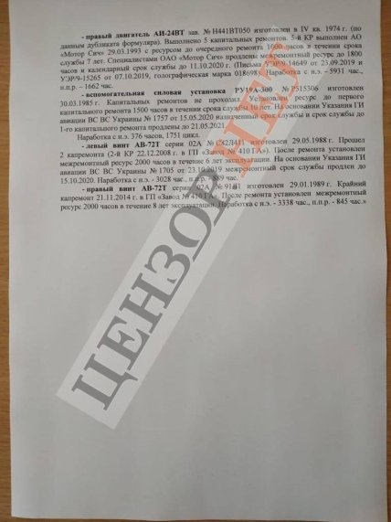По его сведениям, левый двигатель самолета переработал 589 летных часов сверх нормы. Такие данные указаны в официальном заключении о состоянии двигателей самолета от источников в ГП "Антонов", которое с 10 до 20 августа 2020-го года выполняло работы по продлению ресурса самолета.
