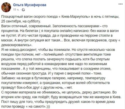 "Я не ковид-диссидент, чтобы вы понимали. Но спустя несколько часов поездки при полном, нет - полнейшем!- отсутствии вентиляции тоже решила, что слегка поспать зачеркнуто подышать хотя бы спертым воздухом перед работой в командировке мне надо по жизненным показаниям", - написала Мусафирова.