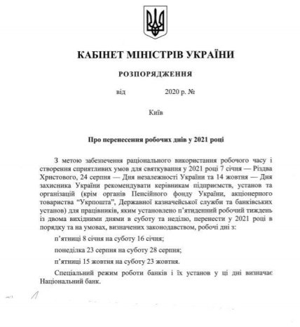 В Украине утвердили график переноса рабочих дней в 2021 году