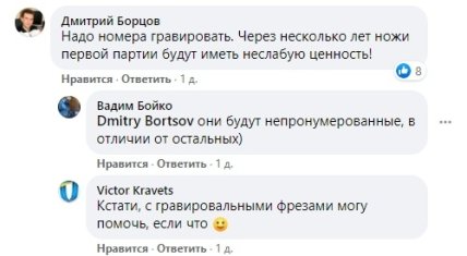 Один из комментаторов предложил снабжать ножи номерами, потому что первая партия наверняка будет иметь со временем большую ценность. А сам автор отметил, что их будет отличать именно то, что они будут непронумерованы.