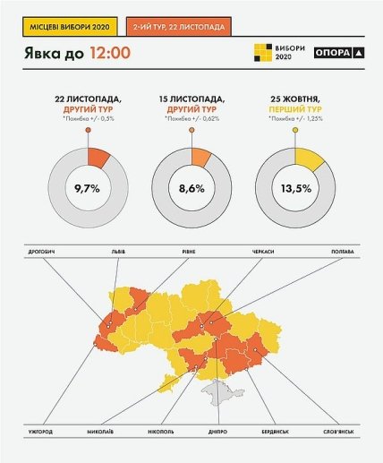 "Во время повторного голосования 22 ноября интегрированная явка избирателей в 11 городах в 12:00 составила 9,7% (погрешность составляет 0,5%)", - рассказали активисты.
