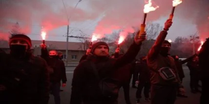 Нацкорпус провел акцию с могильными крестами и баннерами под стенами посольства РФ в Киеве 28 ноября